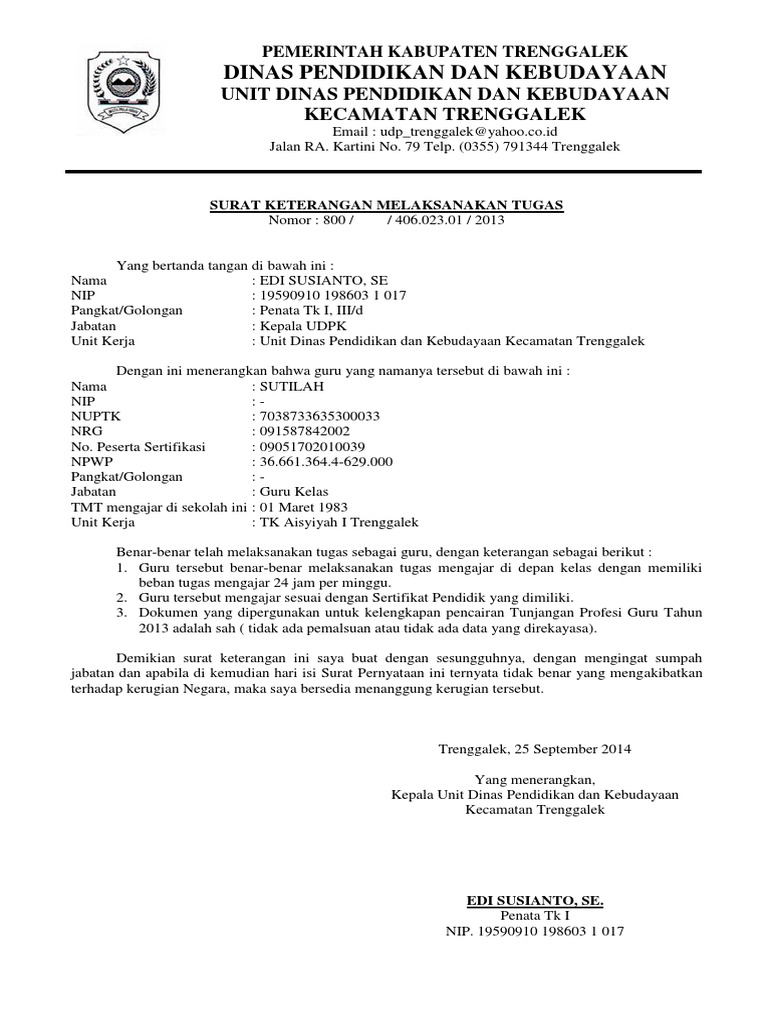 Contoh Format Surat Tugas Mengikuti PLPG Sertifikasi Guru ... from 4.bp.blogspot.com Pengangkatan kepala sekolah dilaksanakan bagi calon kepala sekolah yang telah memiliki surat tanda taman pendidikan dan pelatihan calon kepala. Surat pernyataan kepala sekolah tentang kesiapan penyelenggaraan pembelajaran tatap muka di sekolah/madrasah menjadi salah satu persyaratan yang harus dipenuhi oleh satuan pendidikan baik sekolah/madrasah untuk dapat menyelenggarakan pembelajaran tatap muka di sekolah. Home » surat menyurat » contoh surat keterangan mengajar dari kepala sekolah. Surat pernyataan diri memang ada beragam, tetapi biasanya secara umum itu berisi kesanggupan dari pihak pembuatnya. Seorang kepala sekolah seperti juga guru harus 'ngabehi', artinya harus bisa segalanya. Sebelum mengajukan pengunduran diri dari sekolah sebagai guru tk harus difikirkan masak masak terlebih dahulu. Berikut ini adalah contoh surat pernyataan dari kepala sekolah benar melaksanakan tugas/beban mengajar 29 jam pelajaran tatap muka/minggu (daftar pembagian tugas. Meskipun didalam sekolah tidak bekerja sebagai guru melainkan hanya sebatas tata usaha, namun dalam hal mengundurkan diri tetap harus menggunakan surat pengunduran diri.